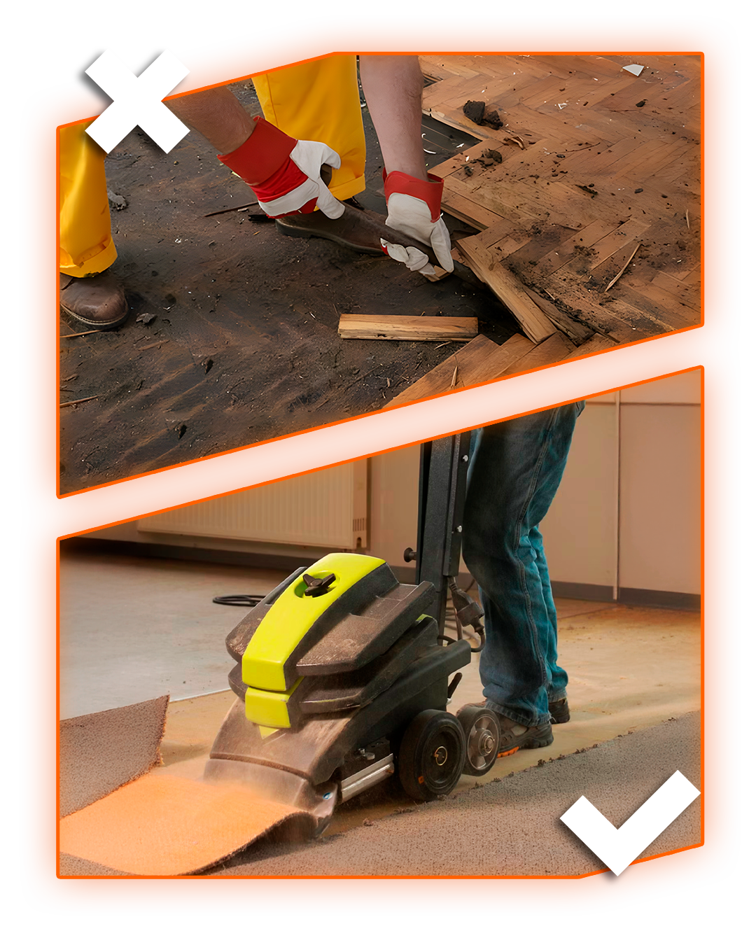 The go-to machine for ripping out hardwood, old carpet, and VCT — quick, clean, no stress.